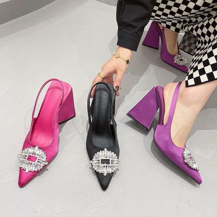 Apne footwear collection ko upgrade karein hamari latest Crystal-Buckle Satin Slingback Heels ke saath. Ye heels sirf footwear nahi, balki ek fashion statement hain. Inka unique Triangle Block Heel design aapko deta hai perfect balance aur ek edgy look jo regular heels se alag hai.